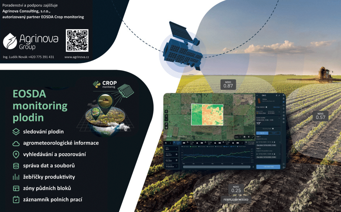 Moderní zemědělství se stále více opírá o technologie chytrého farmaření, které pomáhají agronomům a manažerům činit lepší rozhodnutí na základě dat. Jednou z pokročilých online platforem v této oblasti je EOSDA Crop Monitoring – satelitní systém pro dálkový dohled nad porosty. Tato platforma shromažďuje družicové snímky, vegetační indexy a agrometeorologické informace, aby poskytla okamžitě dostupné poznatky pro promyšlené zásahy na poli. Uživatelé tak získávají aktuální přehled o stavu plodin bez ohledu na to, kde se právě nacházejí. S EOSDA Crop Monitoring mohou agronomové na pár kliknutí sledovat kondici porostů, identifikovat problémové zóny a plánovat agrotechnické zásahy s ohledem na stav plodin, předpověď počasí i riziko chorob. V České republice zajišťuje poradenství a podporu při zavádění této platformy společnost Agrinova Consulting, s.r.o., autorizovaný partner EOSDA Crop Monitoring.