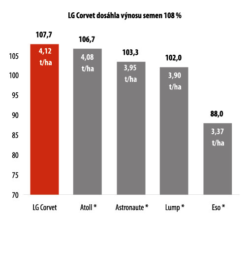 Odrůda LG Corvet byla registrována na jaře 2025 díky vysokému a vyrovnanému výnosu (108 % na průměr kontrol) již po dvou letech registračních zkoušek, tedy ve zkráceném řízení (standardní doba zkoušení jsou 3 roky). Vysoký výnosový potenciál potvrzují i výsledky v rámci zkoušek pro SDO 2023-25. Porovnání výnosu na jednotlivé kontrolní odrůdy je vidět v grafu.